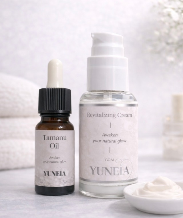■ タマヌオイル × 再生クリーム “整える → 育てる” 2ステップケア STEP1|整える タマヌオイル(ブースター) 洗顔後すぐの肌に。 乾きやすく乱れた肌環境をやさしく整え、 うるおいが入りやすい状態へ導きます。 STEP2|育てる 再生クリーム(仕上げ) オイルで整えた肌を包み込み、 水分と美容成分をキープ。 毎日の積み重ねで、肌本来の力を育てていきます。 セットで使う理由 与えるだけのケアから、 “整えて、育てる”ケアへ。 土台を整え、時間をかけて育てる。 シンプルだけど、続けるほど違いを感じる YUNEIAの基本となる2本セットです。